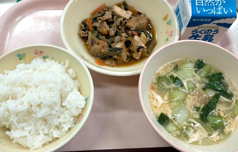 今日の献立は、ごはん、牛乳、卵スープ、ほうれん草と厚揚げの中華炒め です。