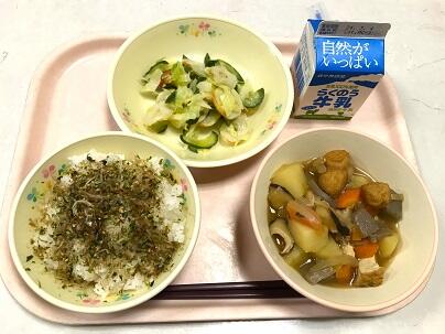 今日の献立は、麦ごはん、牛乳、大豆の五目煮、切り干し大根の酢の物、手作りふりかけ です。