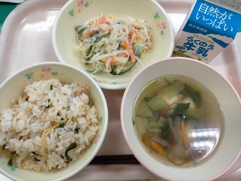 今日の献立は、キムチご飯、牛乳、もずくスープ、春雨マヨサラダ です。