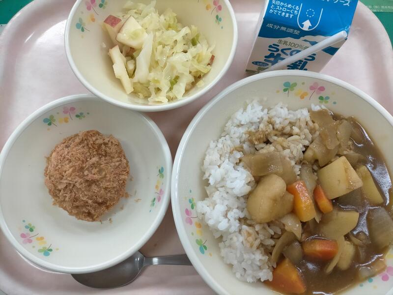 今日の献立は、カレーライス、牛乳、トンカツ、キャベツとりんごのサラダ です。