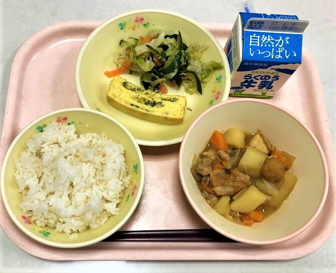 今日の献立は、麦ごはん、牛乳、じゃがいものうま煮、わかめの酢の物、千草焼 です。