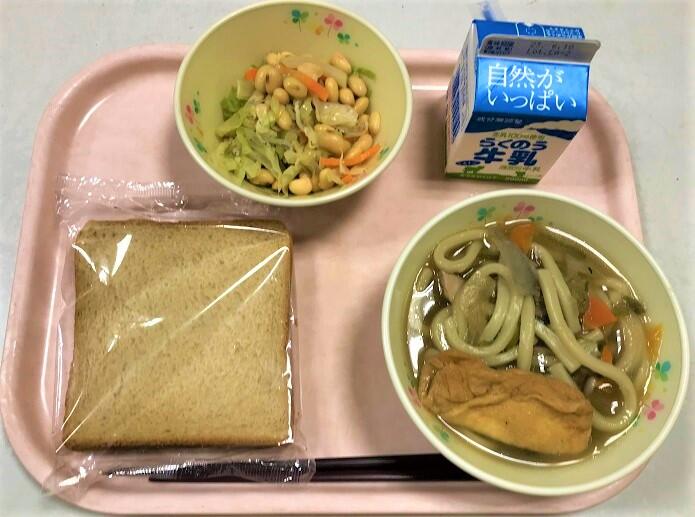 今日の献立は、黒糖パン、牛乳、きつねうどん、じゃこ豆サラダ です。