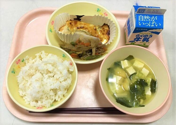 今日の献立は、麦ごはん、牛乳、白身魚のマヨネーズ焼き、豆腐の味噌汁、きんぴらごぼう です。