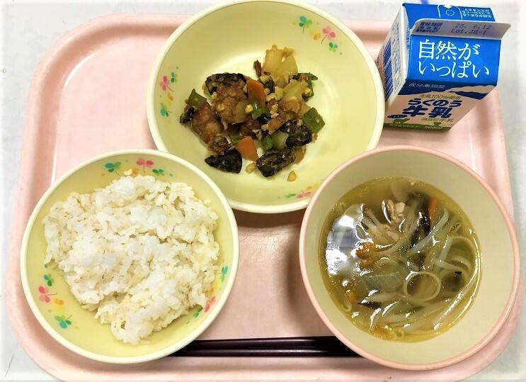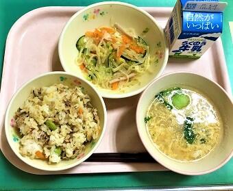 今日の献立は、中華風混ぜごはん、牛乳、チンゲン菜と卵のスープ、マロニーの中華和え です。