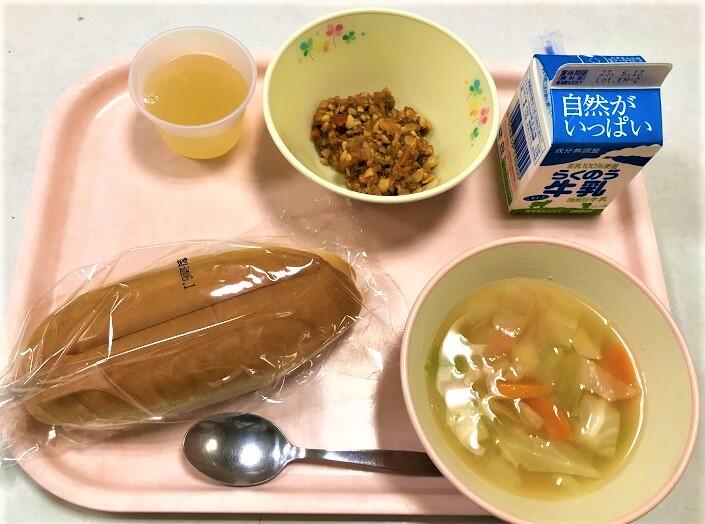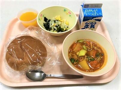 今日の献立は、背割りコッペパン、牛乳、チリコンカン、野菜スープ、手作りりんごゼリー です。