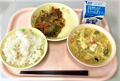 今日の献立は、麦ごはん、牛乳、豚肉の味噌炒め かきたま汁 です。