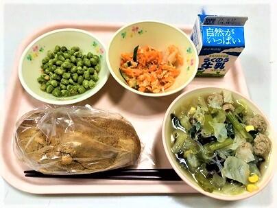 今日の献立は、揚げパン、牛乳、肉団子スープ、ツナサラダ、抹茶ビーンズ です。