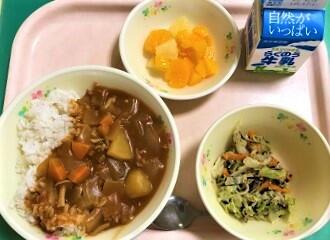今日の献立は、キーマカレー、牛乳、コールスローサラダ、杏仁フルーツ です。