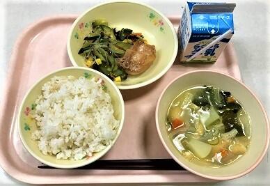 今日の献立は、麦ごはん、牛乳、団子汁、小松菜のおかか和え、高菜の油炒め です。