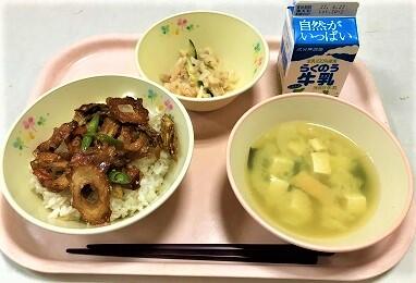 今日の献立は、ごぼうのごまだれ丼、牛乳、豆腐の味噌汁、大根のツナ和え です。