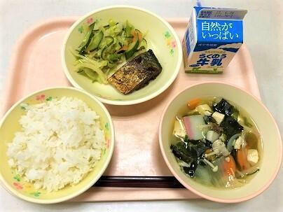 今日の献立は、麦ごはん、牛乳、みそけんちん汁、さばの生姜煮、切り干し大根のごま和え です。