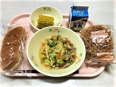 今日の献立は、ミルクパン、牛乳、パリパリ焼きそば、とうもろこし です。