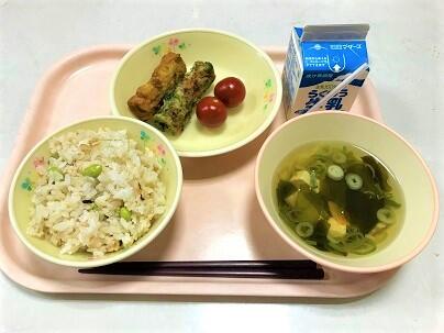 今日の献立は、しょうがごはん、牛乳、豆腐のすまし汁、竹輪の二色揚げ、ミニトマト です。