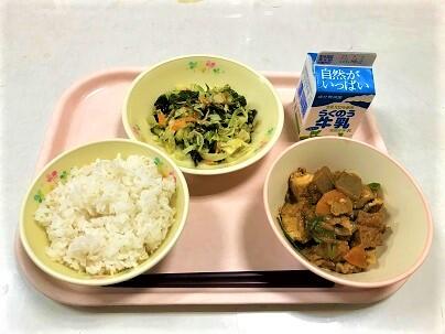 今日の献立は、麦ごはん、牛乳、じゃがいもの味噌汁、鶏の照り焼き、春雨の酢の物 です。