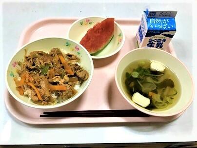 今日の献立は、スタミナ丼、牛乳、はんぺんのすまし汁、すいか です。