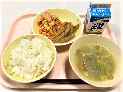 今日の献立は、麦ごはん、牛乳、小いわし梅の香揚げ、にんじんのごまマヨサラダ、豚汁 です。