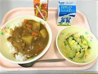 今日の献立は、チキンカレー、牛乳、ハムサラダ、ジューシー です。