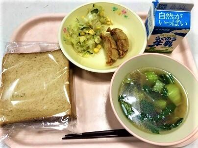 今日の献立は、黒糖パン、牛乳、揚げ餃子、中華サラダ、ワンタンスープ です。