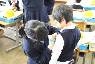 式の前には、教室で6年生に手伝ってもらって名札をつけたり、トイレに行ったりしながら、にぎやかな中にも、いろんな人と仲良くなっていました。