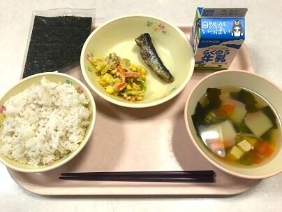 今日の献立は、セルフ恵方巻き(麦ごはん、のり)、牛乳、いわしの梅みそ煮、すまし汁、ツナサラダ です。