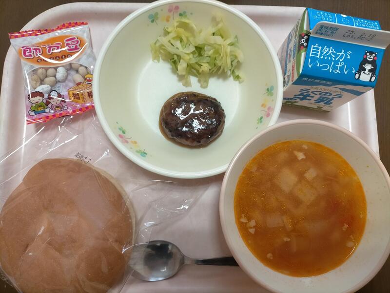 今日の献立は、セルフ照り焼きバーガー、牛乳、冬野菜のミネストローネ、節分豆 です。
