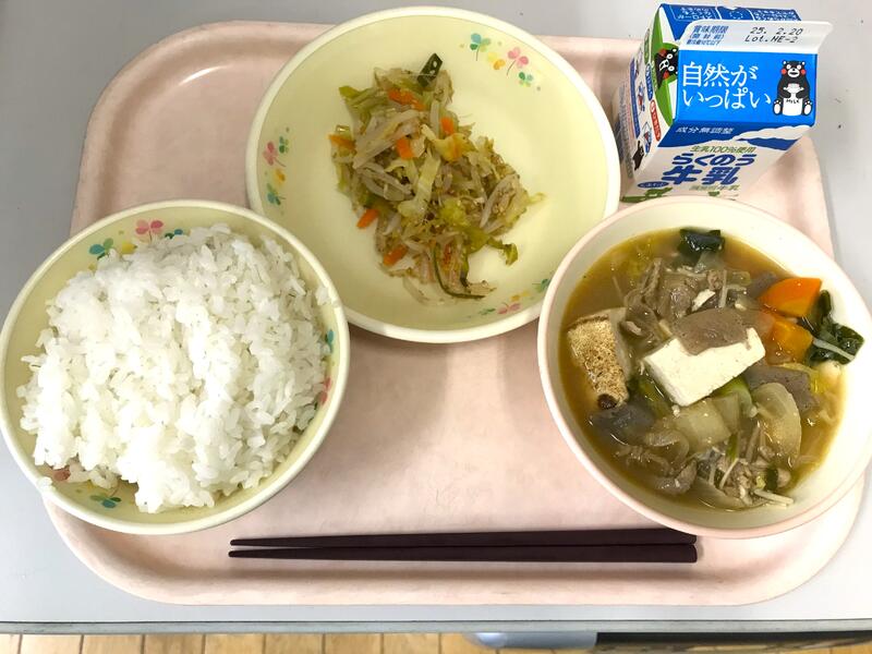 今日の献立は、麦ごはん、牛乳、肉豆腐、ごま酢和え です。