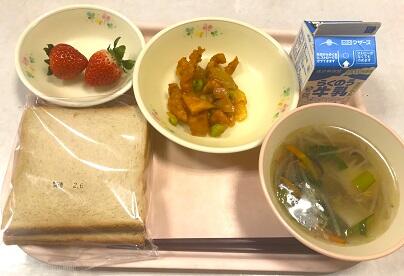今日の献立は、黒糖パン、牛乳、ワンタンスープ、鶏のオーロラ和え、いちご です。