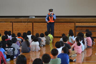 5時間目に、西原村の交通安全協会と駐在所から来ていただき、1・2年生を対象とした交通安全教室を体育館で行いました。最初は、交通安全協会の方から基本的な交通ルールや道路の横断の仕方などをプレゼンを使って教えていただきました。道路を歩くときの「は・ひ・ふ・へ・ほ」は、みんなしっかり覚えたようです。