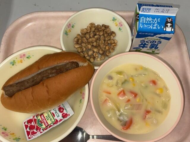 ホットドッグ、牛乳、コーンクリームスープ、こくとうビーンズ