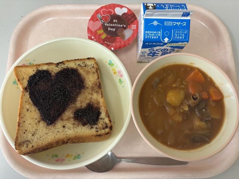 バレンタイントースト、牛乳、ビーフシチュー、カップデザート