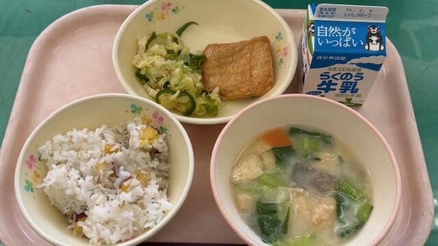 さつまいもご飯、牛乳、呉汁、根菜肉詰め信田、キャベツの梅肉和え