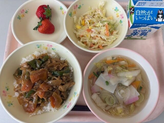 ①あたたかいごはんの上に、お肉と野菜をたっぷりのせたボリューム満点「スタミナ丼」です。 ②春雨スープは、つるつると食べやすい春雨やしょうがを使っているので体がぽかぽかあたたまります。 ③タンパク質を多く含む、ささみとしゃきしゃきのやさいの組み合わせを楽しむことができるサラダです。 ④いちごは旬の果物でみずみずしく、ビタミンが沢山含まれています。