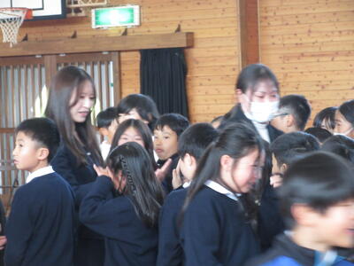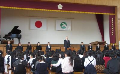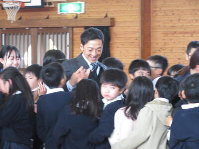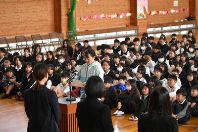春のやわらかい日差しの中、校庭の桜もきれいに咲きそろってきました。今日は、これまでお世話になった10人の先生方の退任式を行いました。子ども達は、これまでの感謝を胸にたくさん集まりました。