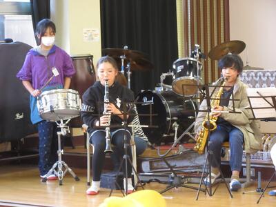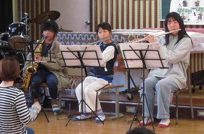 お昼休みに、放課後活動している音楽クラブが、ライブを行いました。SEKAI NO OWARIの曲やクリスマスにちなんだ「聖者の行進」など楽しい曲を聴かせてくれました。日頃近くで見ることのない楽器に、興味津々な子ども達でした。
