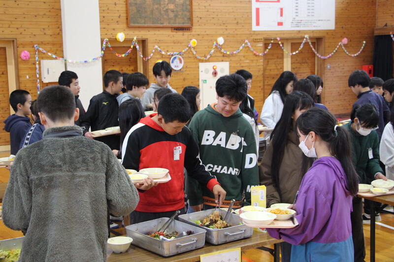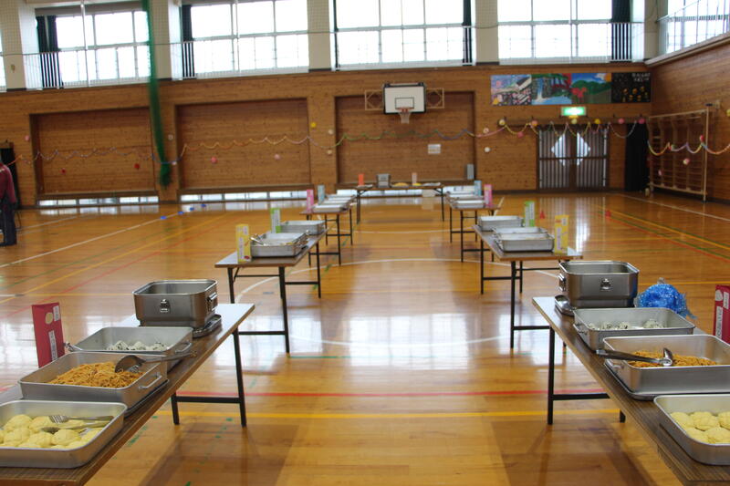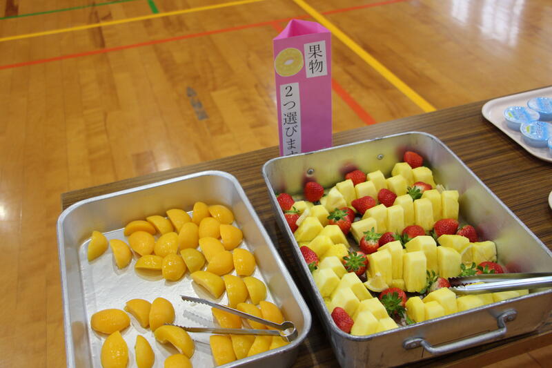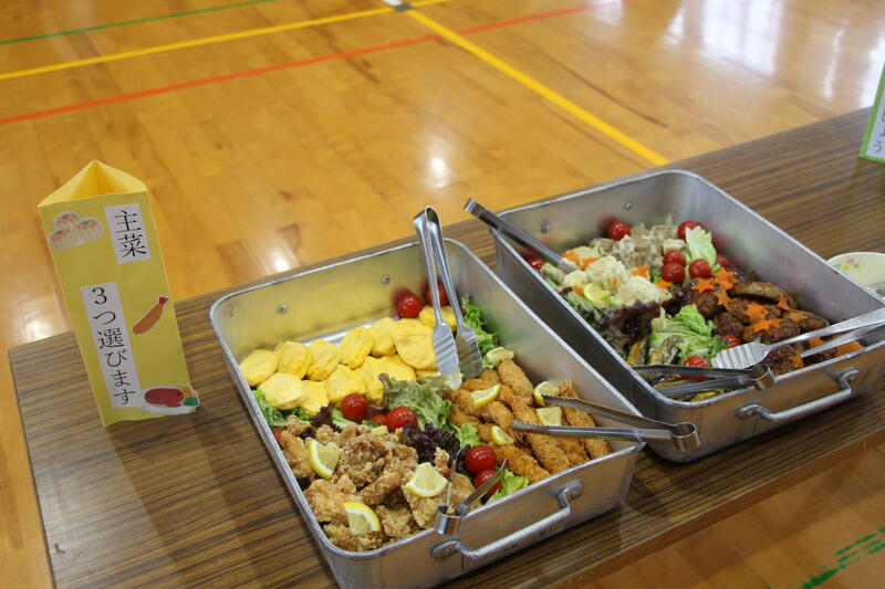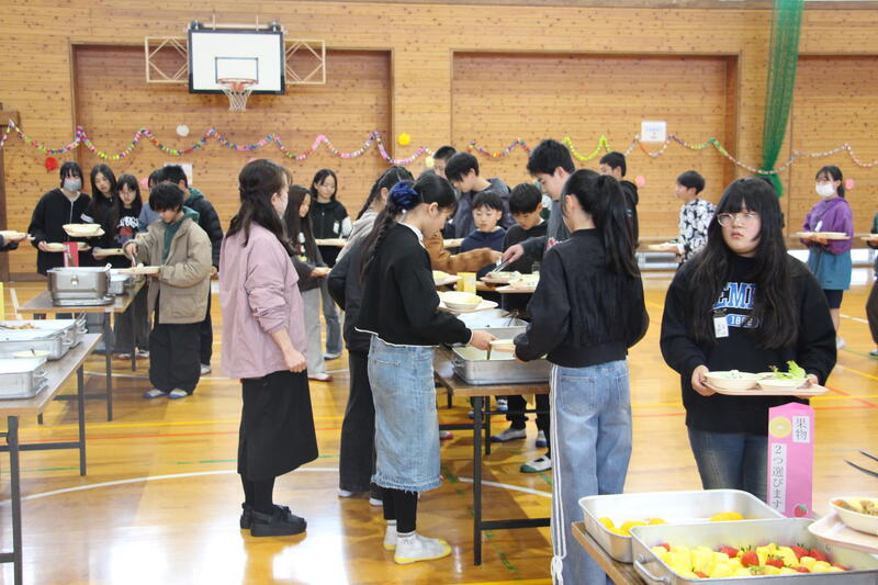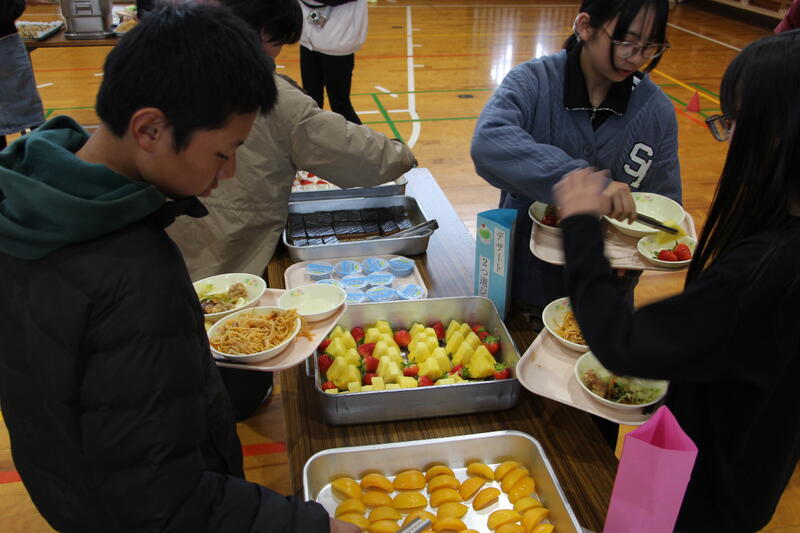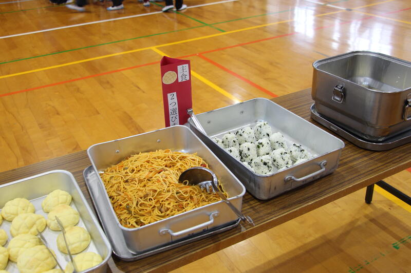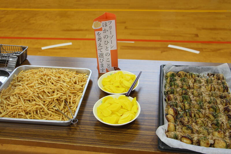 ナポリタンとご飯だけでお皿がいっぱいになっている人、いろんな食材をお皿の中いっぱいに取っている人・・・。個性が出ますね。でも、みんな楽しそうに食べていました。