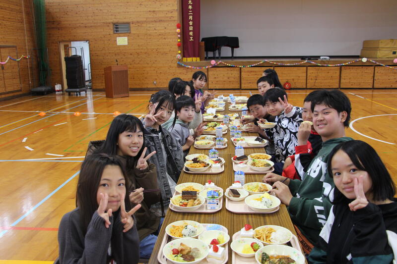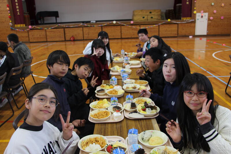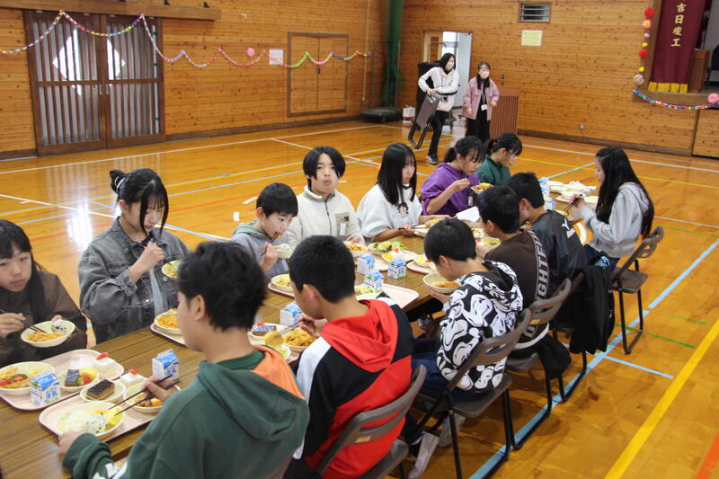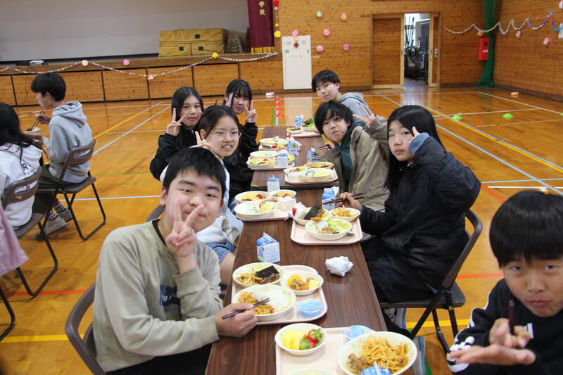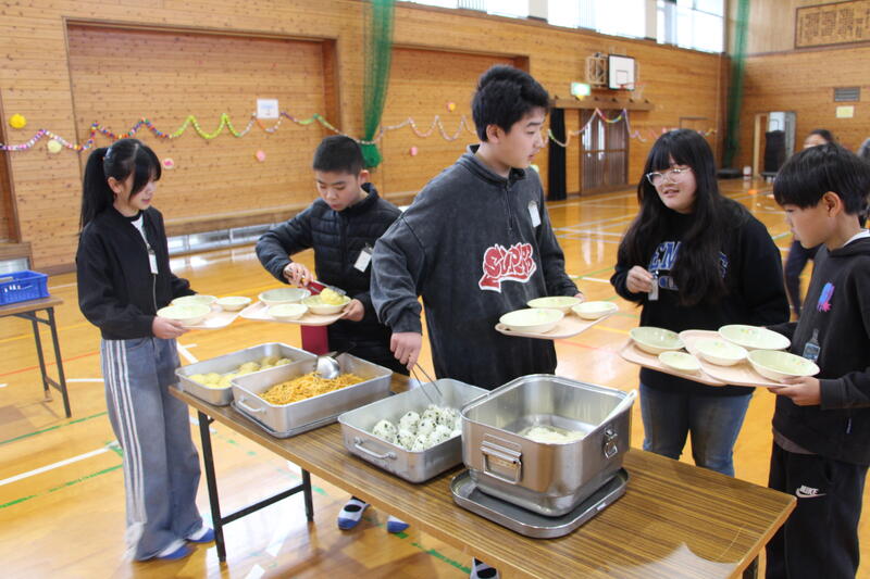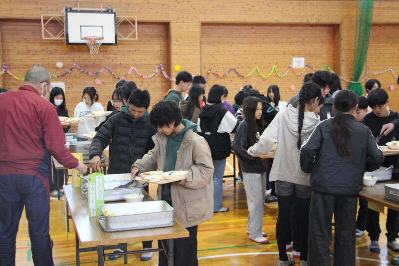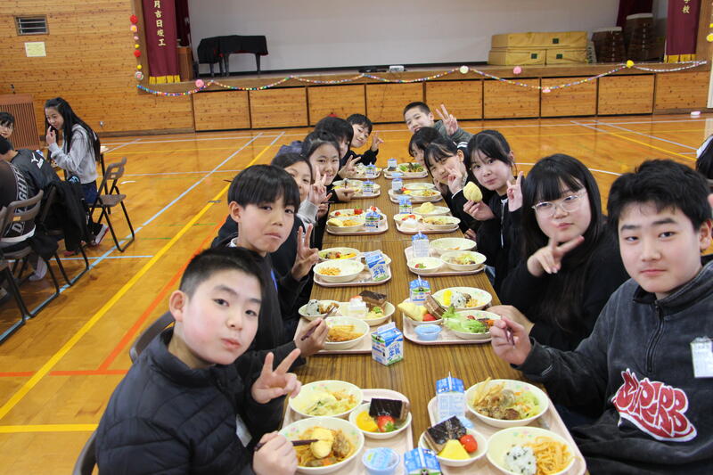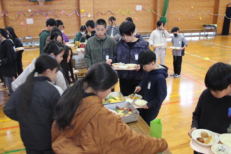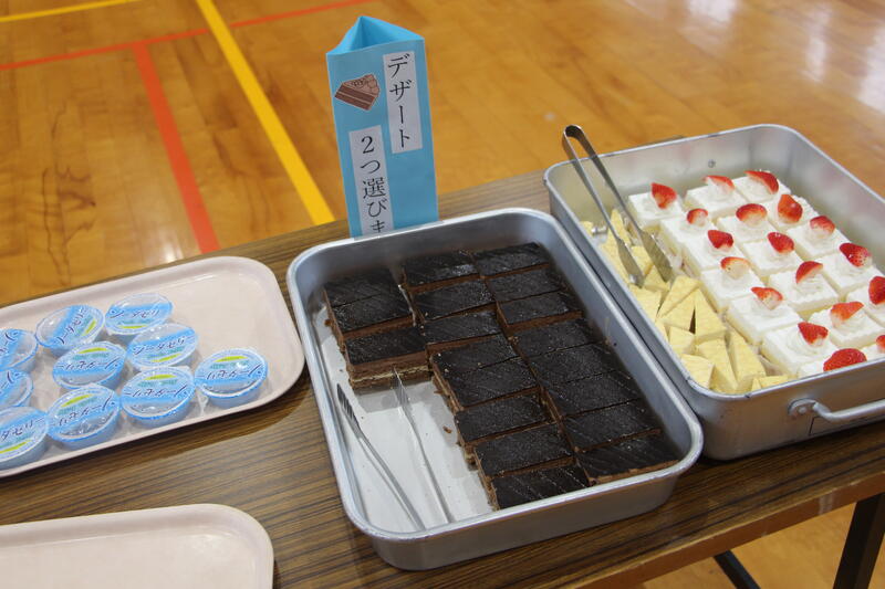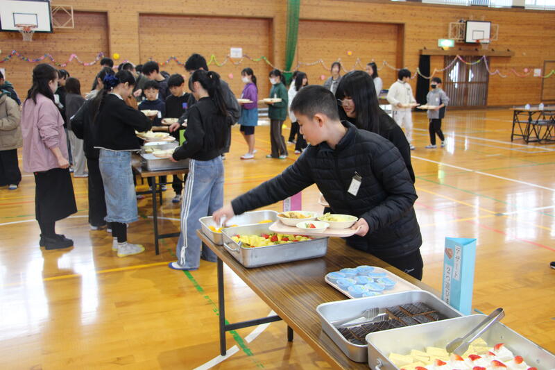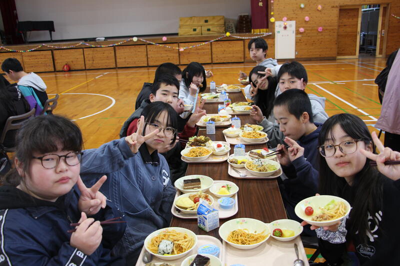 卒業を前に、6年生を対象としたバイキング給食「お別れバイキング」がありました。この日の6年生は、体育館での給食でした。