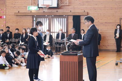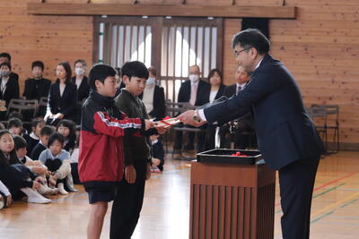 1年生から5年生までの子どもたちが修了式を迎えました。各クラスの代表が、緊張した面持ちで校長先生から修了証を受け取りました。