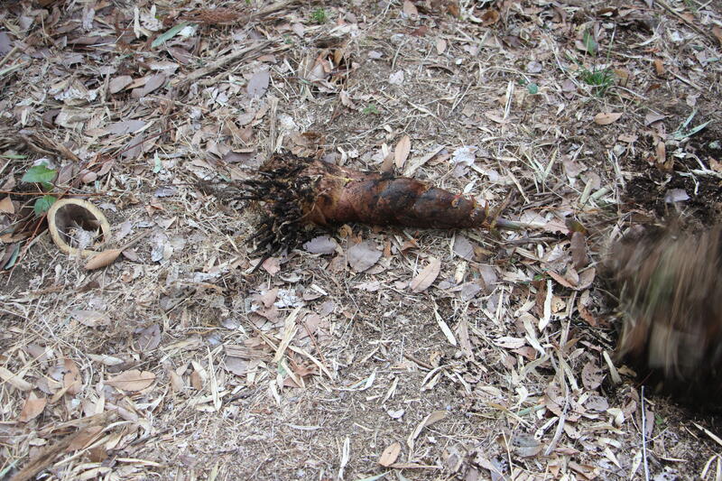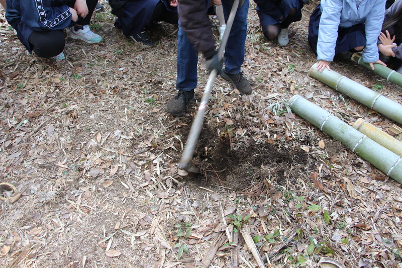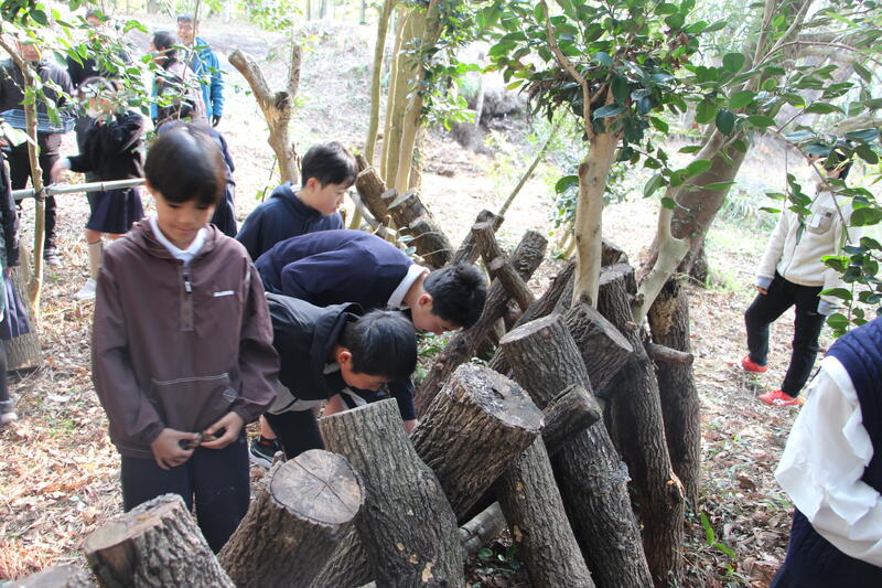 3月16日、学校運営協議会委員長の曽我さん、竹林を管理しておられる大塚さん、元PTA会長の坂本さん方にも参加していただき、6年生のみなさんで椎茸を収穫しました。