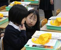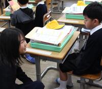 本日、新しい標準服にピカピカのランドセルを背負った55名の1年生を迎えました。おうちの人と離れ、初めての教室に入って緊張した1年生。6年生のお兄さん・お姉さんが優しく迎えてくれました。