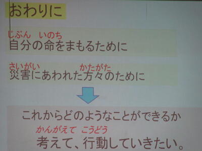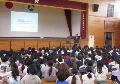 熊本地震の後、避難所になった小学校のことを話していただきました。村を元気にするために小学生が自主的に行った「避難所の玄関掃除」「避難所の方との交流」「うたで村を元気に」したお話でした