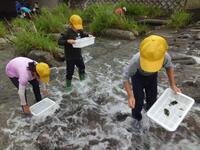 河原小学校の4年生と合同で、河原小学校前の滝川で、第二高校の生物部の学生さんに指導を仰ぎながら水生生物調査を行いました。