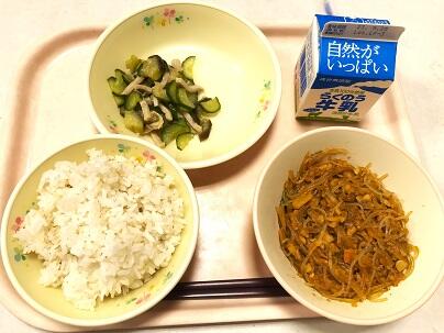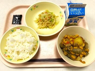 今日の献立は、ごはん、牛乳、大豆の五目煮、切り干し大根の酢の物、ひじきのり佃煮 です。