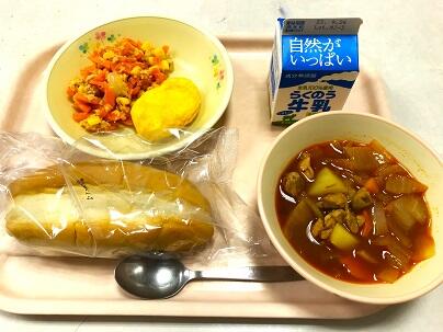 今日の献立は、ソフトフランスパン、牛乳、オムレツ、コック・オー・ヴァン、人参サラダ です。
