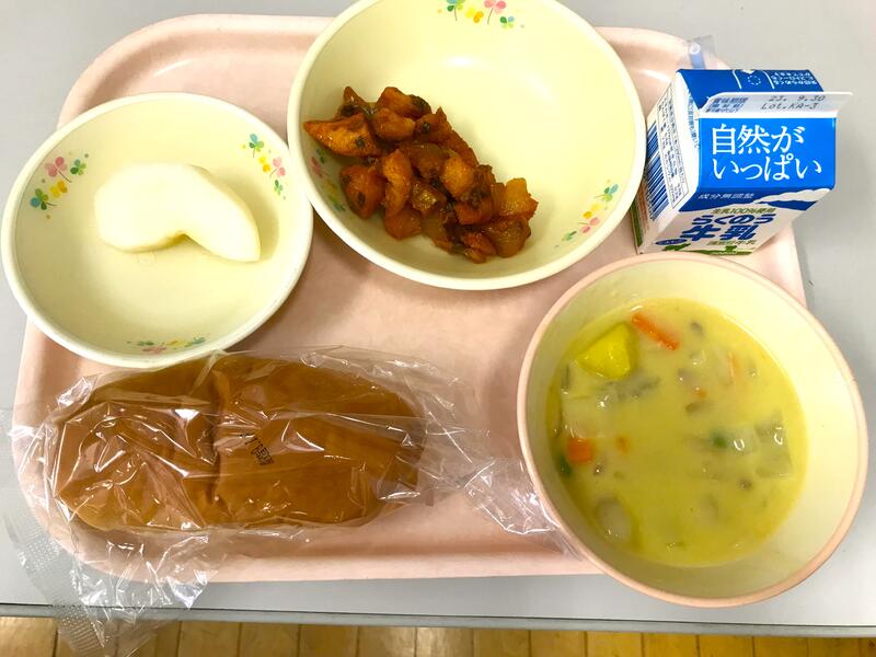 今日の献立は、コッペパン、牛乳、魚のチリソース、豆乳のクリームスープ、梨 です。