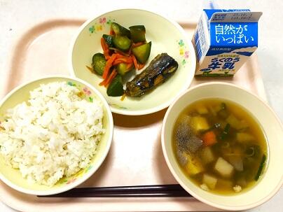今日の献立は、麦ごはん、牛乳、さんまのみぞれ煮、つぼん汁、カリカリきゅうり です。