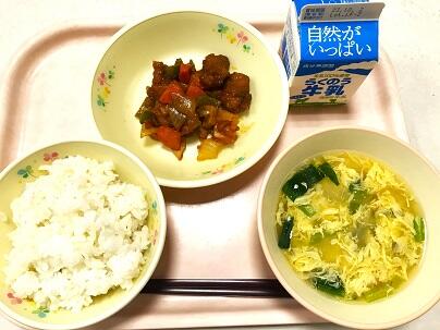 献立は、麦ごはん、牛乳、酢どり、卵スープ です。