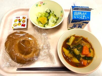 今日の献立は、ひのくにパン、牛乳、じゃがいものケチャップ煮、甘夏サラダ、型抜きチーズ です。
