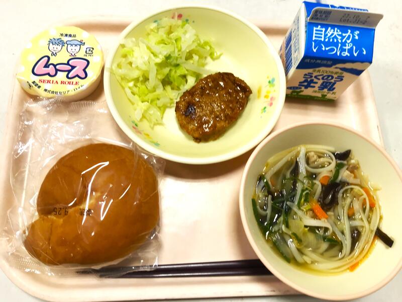 今日の献立は、セルフ照り焼きバーガー、牛乳、クイッテオスープ、ムース です。