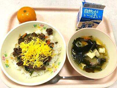 今日の献立は、あか牛ビビンバ、牛乳、わかめスープ、冷凍みかん です。