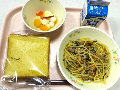 今日の献立は、かぼちゃパン、牛乳、ひじきスパゲティ、お月見フルーツミックス です。